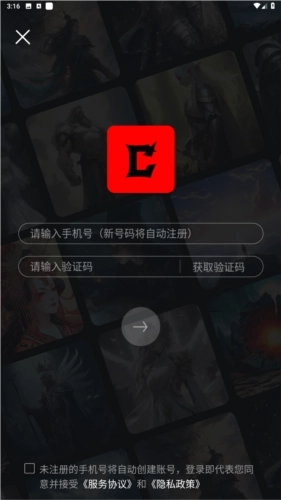 2、在登录页面中输入手机号和验证码;