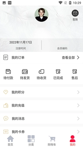 5、点击“我的”,即可查看个人的订单信息,以及卡券、积分等相关内容。