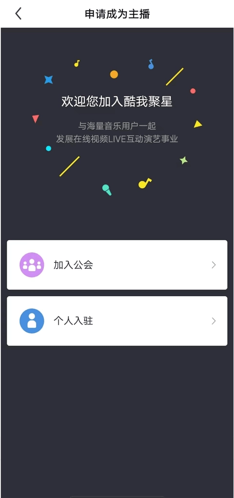 3、进入后申请成为主播,之后会看到【加入公会】和【个人入驻】两个选项,这里建议选择个人入驻。其实不管是加入公会还是个人入驻,只要直播内容新颖且坚持不懈地努力,都能在直播中获得不错的收益,只是加入公会后,收益的一部分需要交给公会。