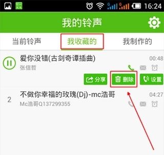 通常你设置过的铃声会显示在“我的收藏”里,点击“删除”即可。