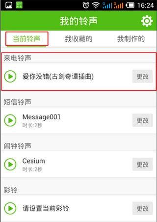 1、进入我的铃声页面后,点击“当前铃声”,再选择“来电铃声”;若你对当前铃声不满意,点击“更改”即可。