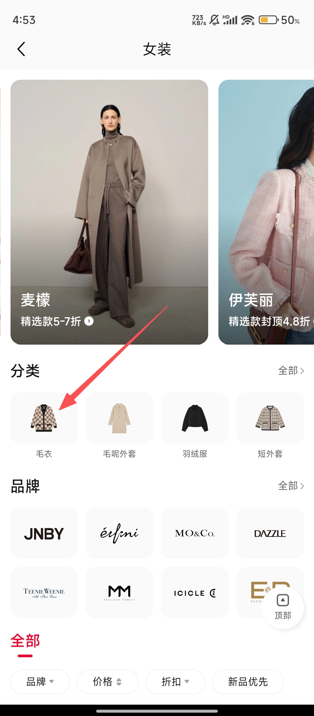 进入女装专区后,点击【毛衣】分类,就能浏览到各式各样的毛衣款式,轻松找到符合你心意的风格。