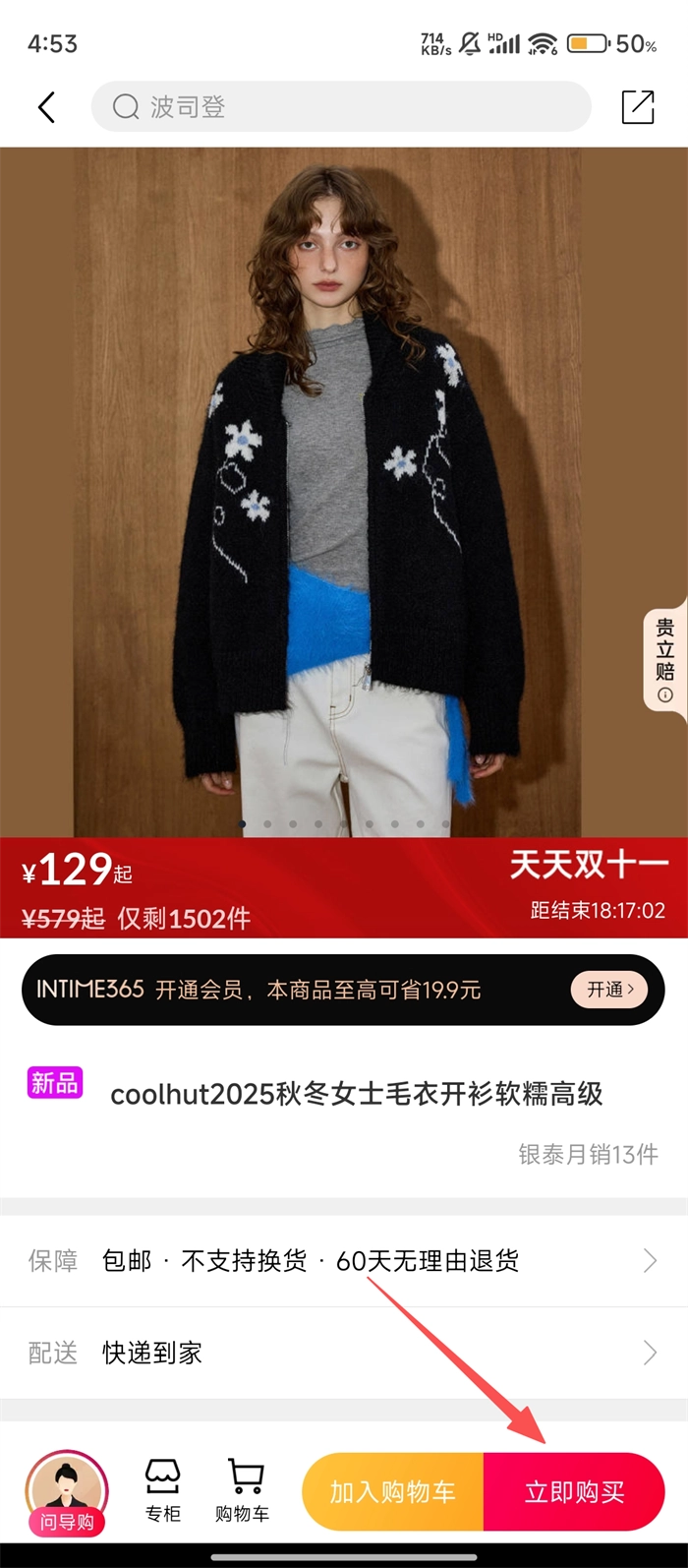 进入商品详情页面后,点击【立即购买】按钮,就能完成下单流程,顺利将心仪的毛衣收入囊中啦。