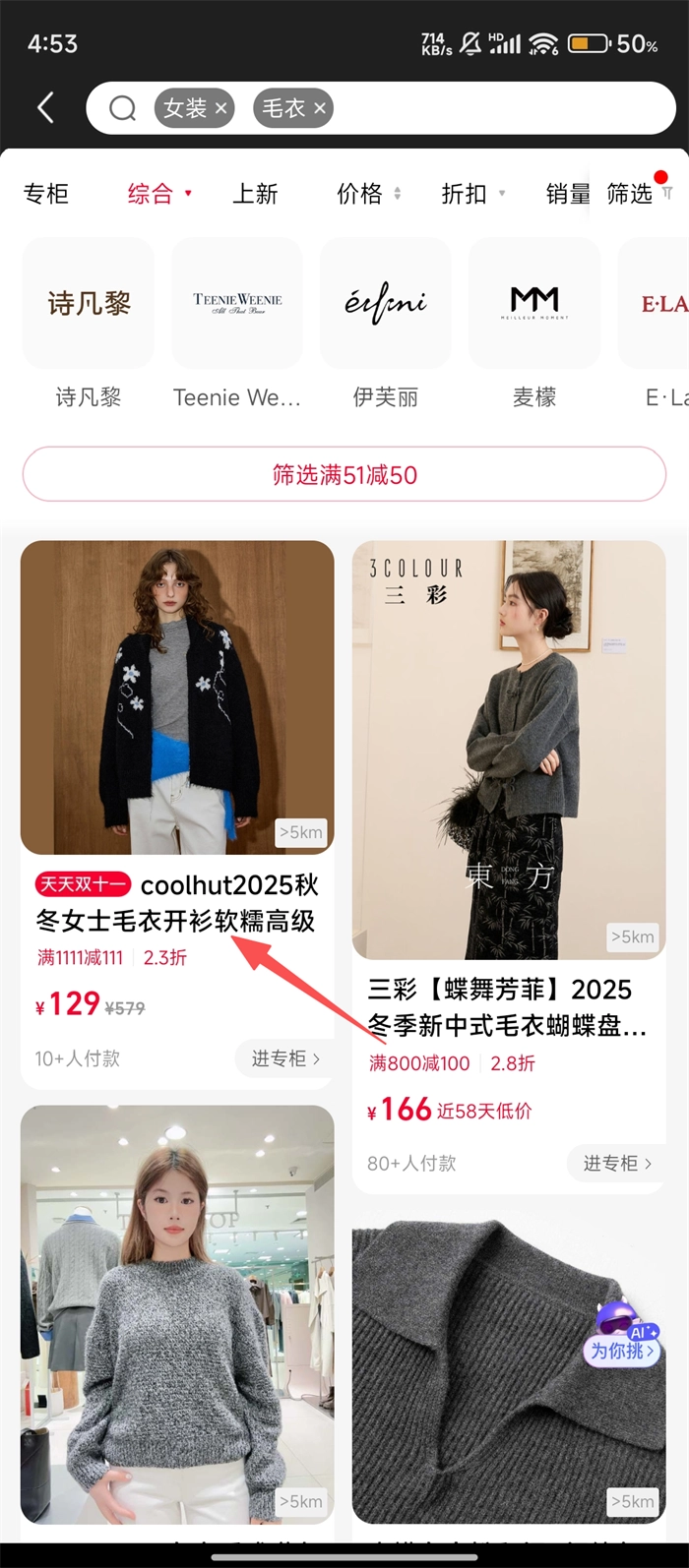 在毛衣列表里,挑选出心仪的【coolhut2025秋冬女士毛衣开衫】,点击进入详情页面,查看更多商品相关信息。