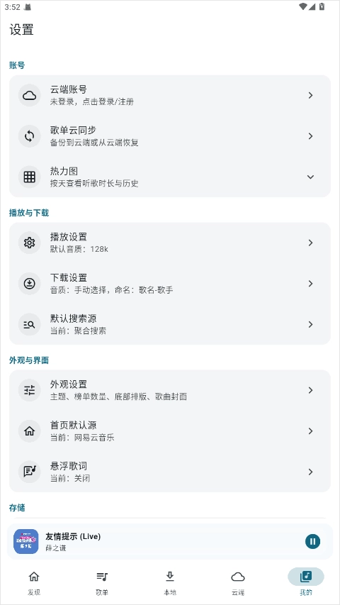 7、进入“我的”设置中心,能够对播放音质、缓存路径、歌词显示样式进行调整,从而自定义App的使用体验。