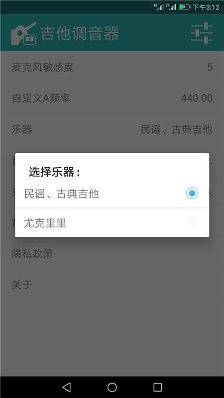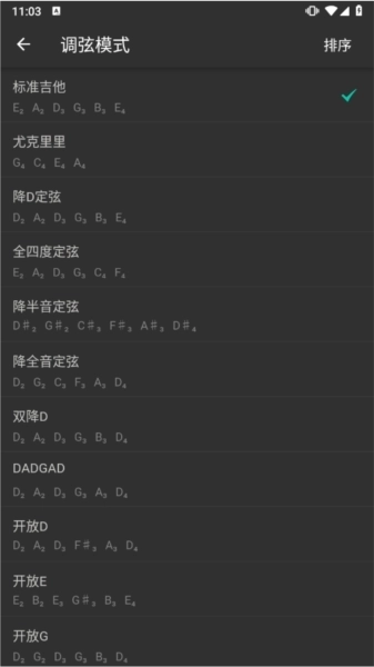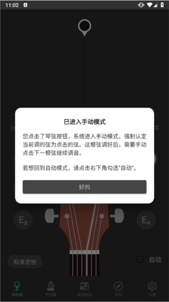 选择调音模式:一般会有吉他、尤克里里这类乐器模式供挑选,选择与之对应的乐器模式即可。