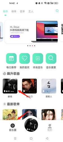 启动软件后,先点击“音乐圈”这个选项,接着再点击“音乐搜索”选项。