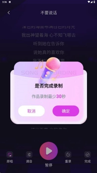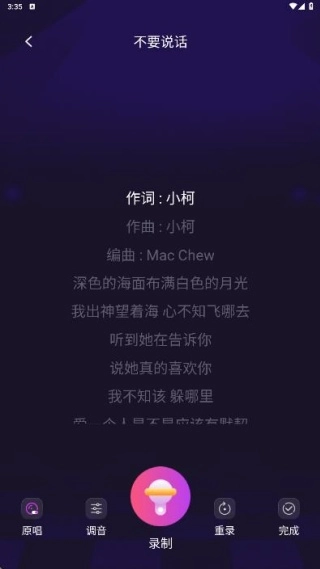 进入歌唱模式后,会呈现原唱、调音、录制、重录、完成等功能,便于你进行表演,同时还会同步显示歌词。